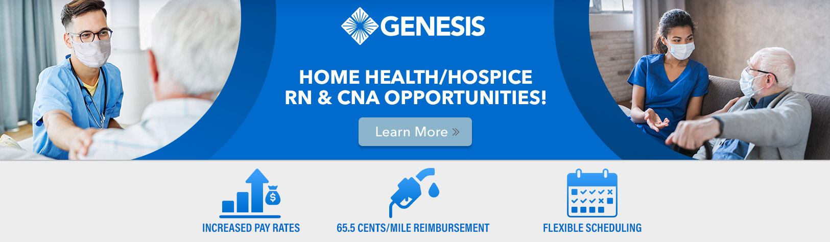 If you’re an experienced registered nurse or certified nursing assistant looking for flexibility and autonomy, look no further than Genesis VNA Home Health Services. We have excellent opportunities for home health RNs and CNAs to work 8:00 – 16:30 and all shifts are available for hospice nurses. Our RNs only work 1 weekend every 8 weeks and 1 holiday per year!
